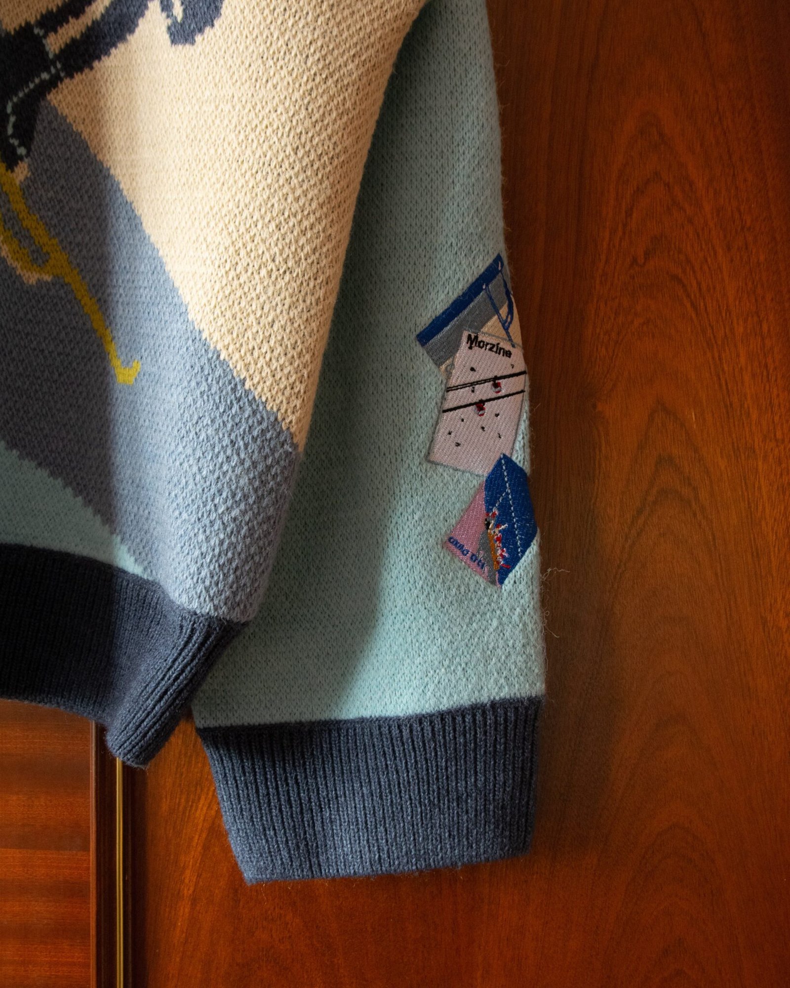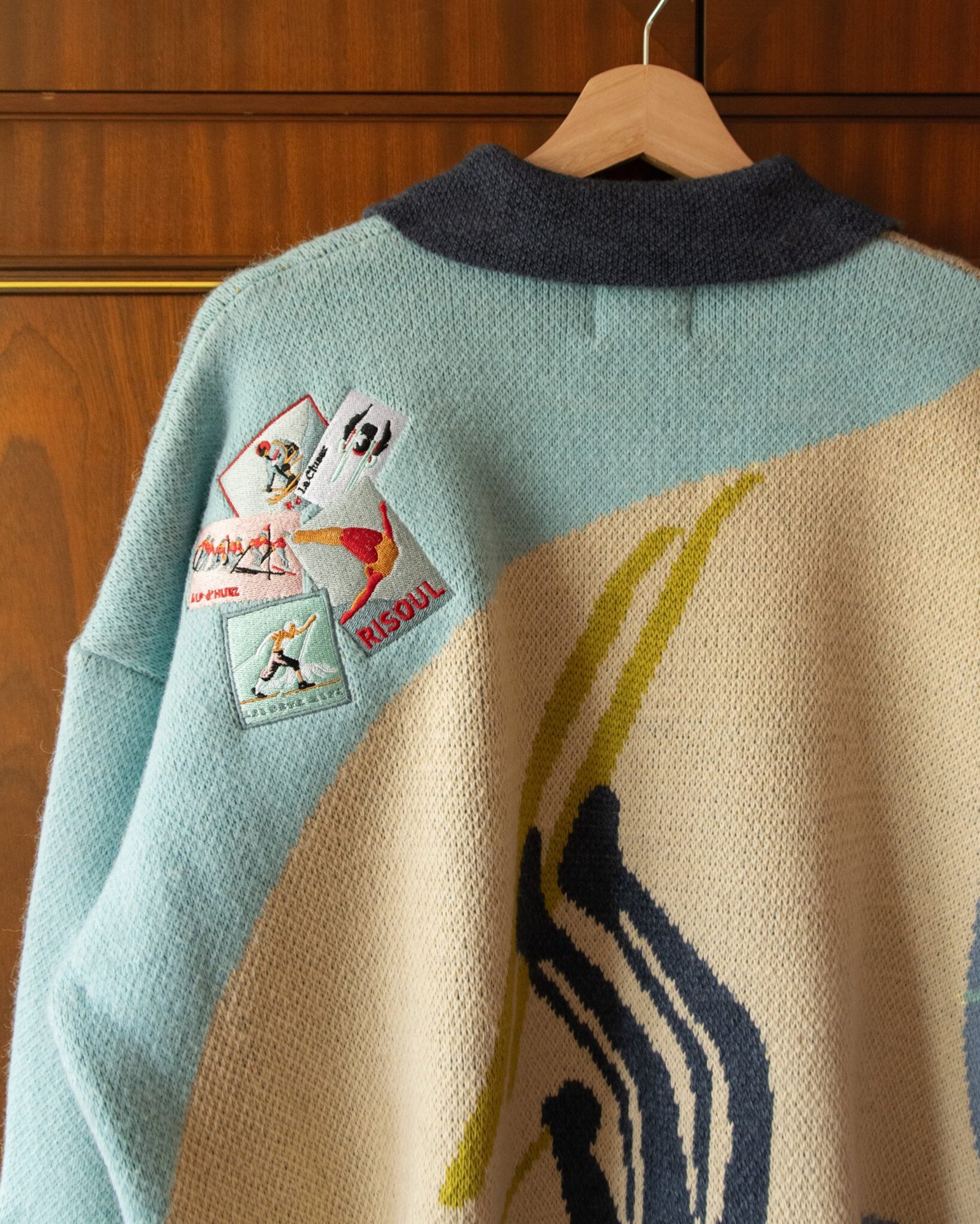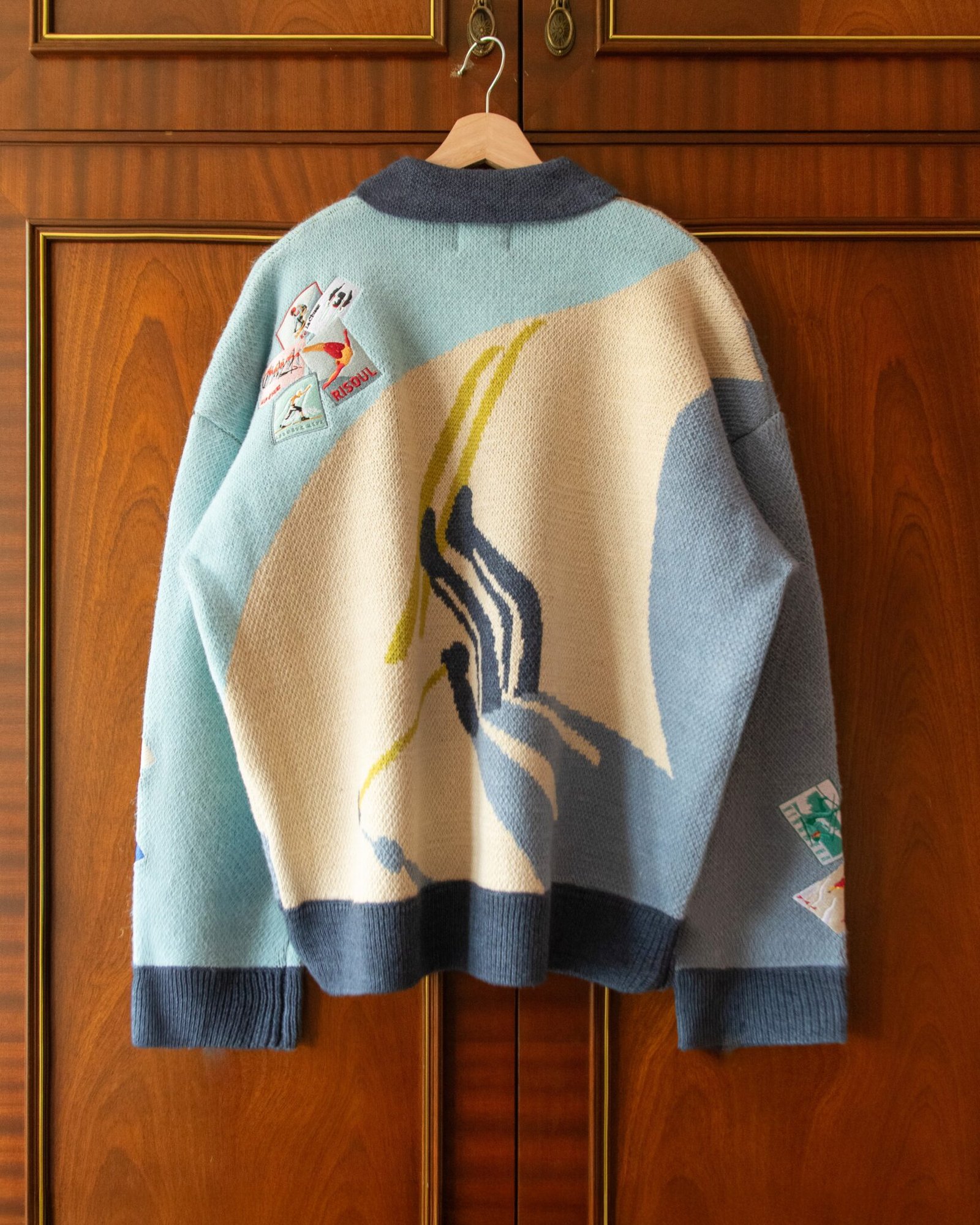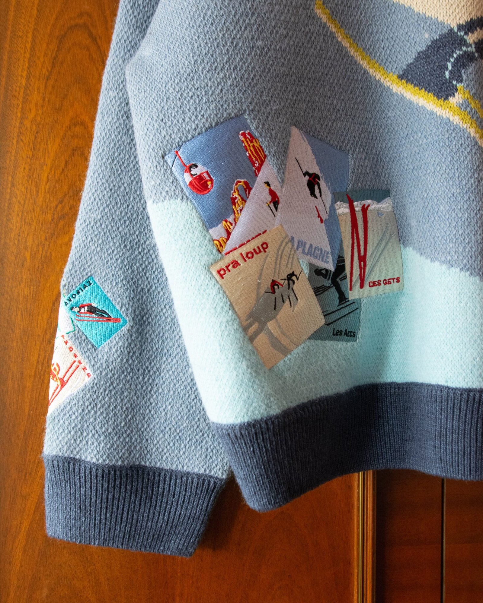 KNITTED SKI JUMPER WITH EMBROIDERED POSTCARDS